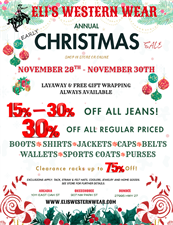Eli's Early Christmas Sale November 28th through November 30th. 15% - 30% off all jeans, 30% off all regular priced boots, shirts, jackets, caps, belts, wallets, sports coats and purses. Clearance racks up to 75% off. Exclusions apply see store for more details. As always we offer FREE GIFT WRAPPING and LAYAWAY. We have something for everyone on your Christmas list!