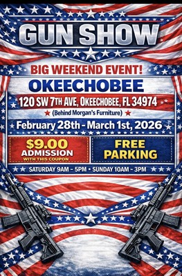 Join us for the Okeechobee Gun Show – Big Weekend Event on February 28th & March 1st, 2026, located at 120 SW 7th Ave, Okeechobee, FL 34974 (behind Morgan’s Furniture).